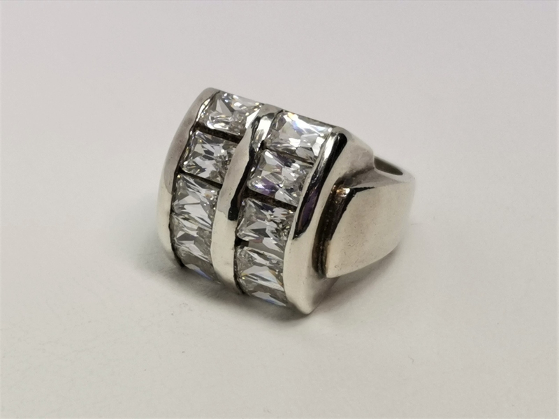 Exkluzivní masívní stříbrný prsten s velkými bílými zirkony. Tento prsten je netradičního tvaru, je velmi originální, na ruce nepřehlédnutelný.