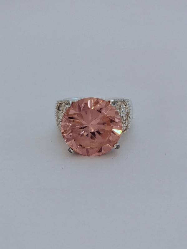 Exkluzivní robustní stříbrný prsten s velkým růžovým zirkonem pr.15 mm, který je kolem dozdoben menšími zirkony.