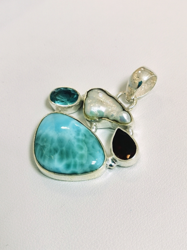 Luxusní stříbrný přívěsek ozdobený přírodním larimarem modré barvy, akvamarínem, almandinem a perletí. Přírodní larimar se vyznačuje častými inkluzemi v podobě tmavších skvrn, map, apod. Přívěs je okouzlující. Krásný kámen, který je bytelně vsazený tak, aby nebyla nijak rušena jeho krása.