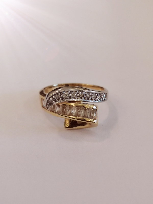 Krásný, masívní, elegantní prsten ze žlutého zlata v kombinaci se zlatem bílým, který je zdoben malými bílými zirkony. Je moderního designu. Velikost 53 patří mezi velikosti středního prstu. Prsten můžeme nosit samotný, tím podtrhneme jeho krásu. Ale může být také doplněn ostatními menšími prsteny, ze kterých bude vynikat.