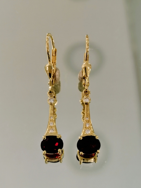 Luxusní zlaté visací naušnice s brilianty a českým granátem je vynikající zakázková ruční práce.