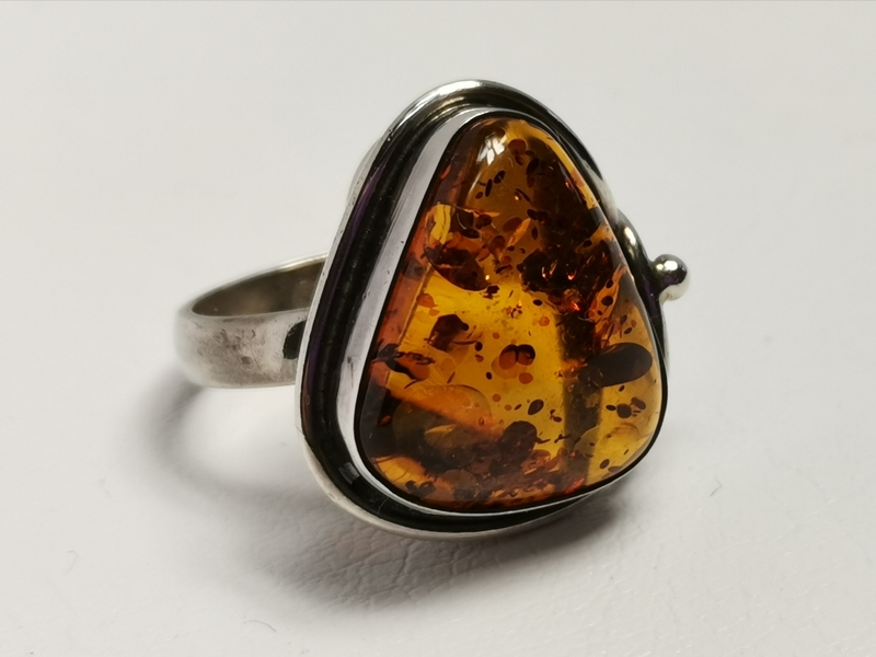 Stříbrný prsten s krásným velkým přírodním jantarem trojúhelníkového tvaru. Jantar je velice krásný. Velikostí 61 může zdobit dámskou ruku (větší prst). Na ruce vynikne, pokud bude prsten na ruce sám.