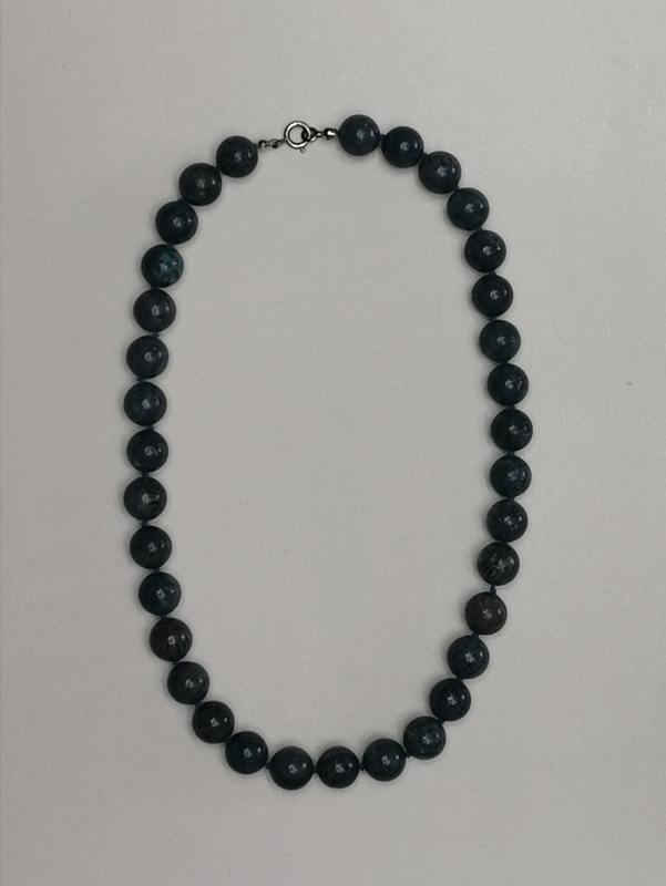 Náhrdelník z leštěných kuliček modrého korálu, zasukované, uzávěr ze stříbra. Náhrdelník má krásnou modrošedou barvu. Svojí délkou sahá cca 5 cm pod klíční kost.