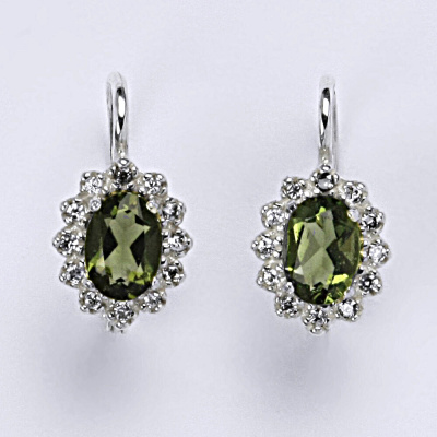 Stříbrné naušnice s broušeným oválným vltavínem, kolem kterého jsou vsazeny bílé zirkony. Ty naušnice úplně rozzáří. Na uších vypadají velice luxusně.