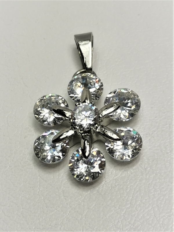 Luxusní, extravagantní přívěs z chirurgické oceli ve tvaru kytičky. Ta je zdobená krásně broušenými bílými zirkony, které se nádherně třpytí.