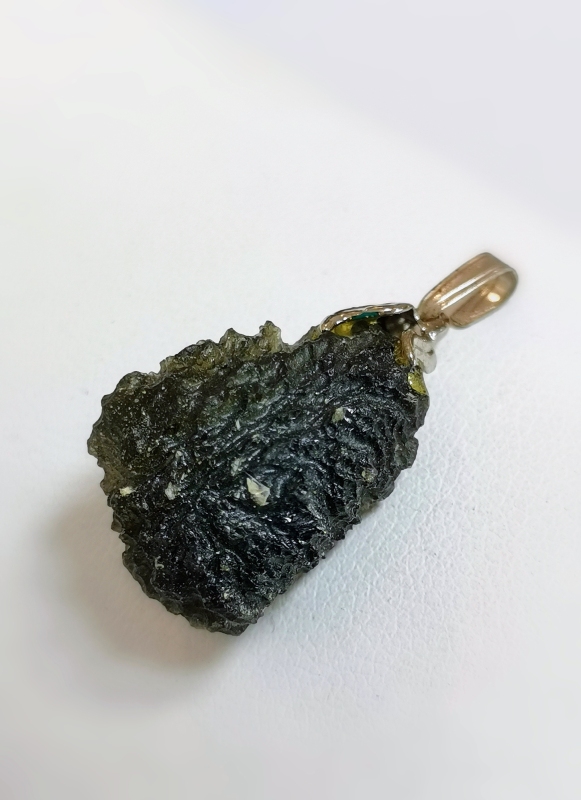 Krásný vltavínový přívěs. Vltavín je doplněn závěsem z obecného kovu bílé barvy.