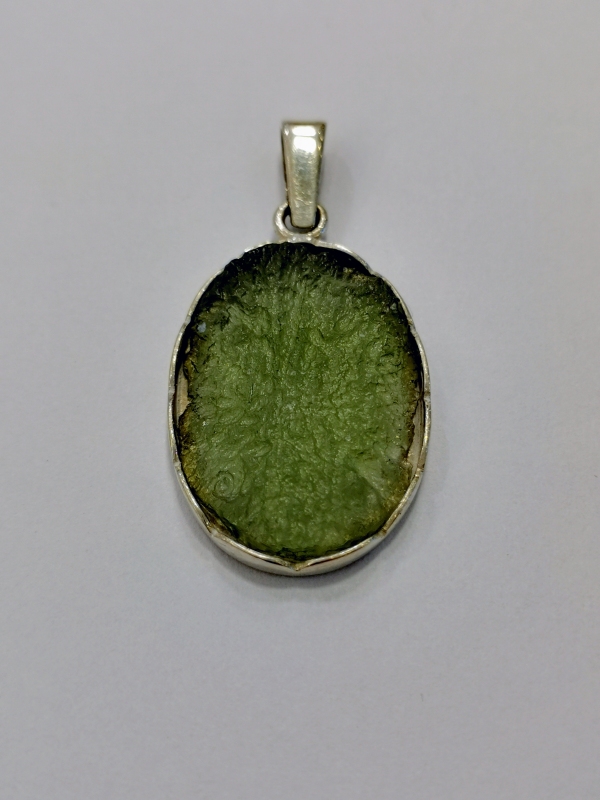 Přívěšek z přírodního vltavínu, obroušeného do oválného tvaru. Vltavín je pro šperk vybrán na základě barvy a skulptace, která musí být jemná. Zakázková ruční práce. Přívěs je krásný, velice elegantní.