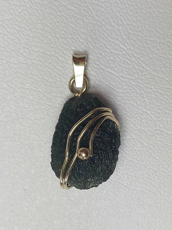 Přívěšek z přírodního vltavínu podlouhlý s ouškem ze žlutého zlata, zakázková ruční práce. Je krásně zdoben žlutými zlatými drátky a zlatou kuličkou. Přívěs je velmi elegantní, jemný.