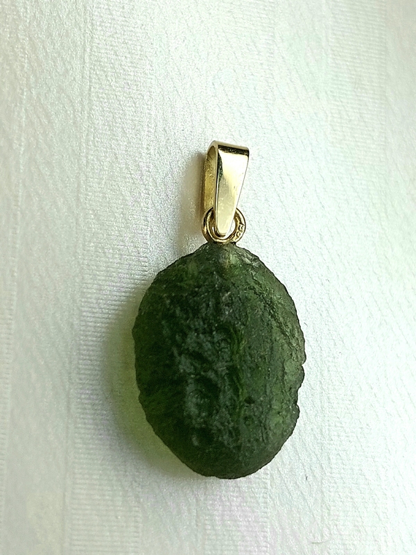 Přívěšek z přírodního vltavínu. Vltavín je pro šperk vybrán na základě barvy, skulptace, která musí být jemná, a dalších vlastností. Přívěs je oválný s ouškem ze žlutého zlata. Zakázková ruční práce. Přívěs je krásný, velice elegantní.