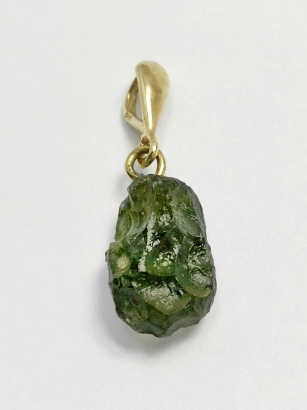 Přívěšek z přírodního vltavínu. Vltavín je pro šperk vybrán na základě barvy, skulptace, která musí být jemná, a dalších vlastností. Přívěs je oválný s ouškem ze žlutého zlata. Zakázková ruční práce. Přívěs je krásný, velice elegantní.
