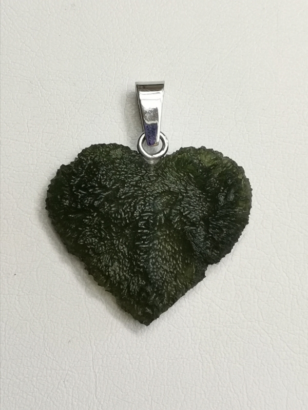- Přívěsek z přírodního vltavínu ve tvaru srdce s masivním ouškem z bílého zlata