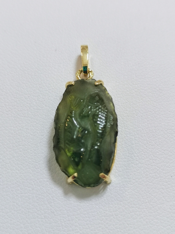 Na rubu přívěšku jsou ze zlata ztvárněny ryby - astrologické znamení. Přívěs můžeme nosit oboustranně. Skulptace vltavínu na rubové straně je přírodní.