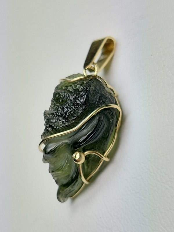 Přívěšek z vltavínu ve tvaru trojúhelníku s masivním ouškem ze žlutého zlata. Na vltavínu jsou vybroušené vlnky, zakázková ruční práce.