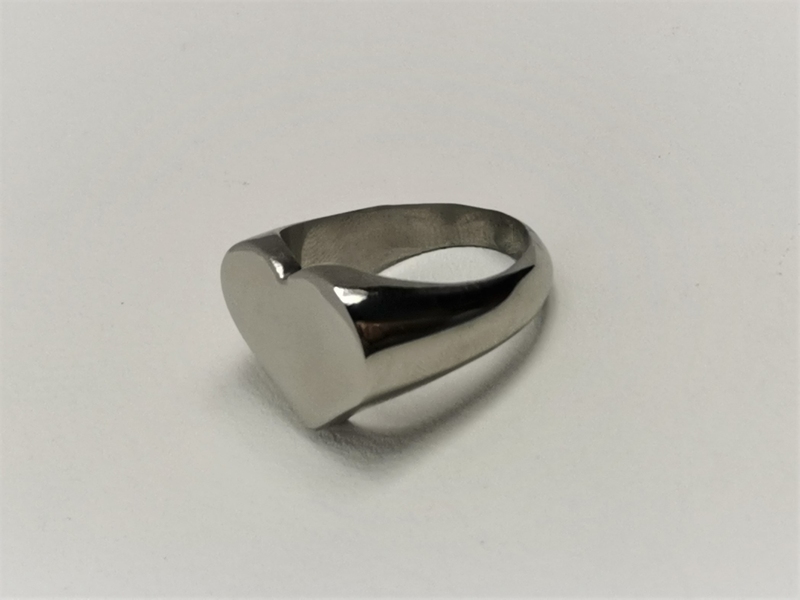 Prsten z chirurgické oceli ve tvaru srdce. Prsten je hladký, leštěný.