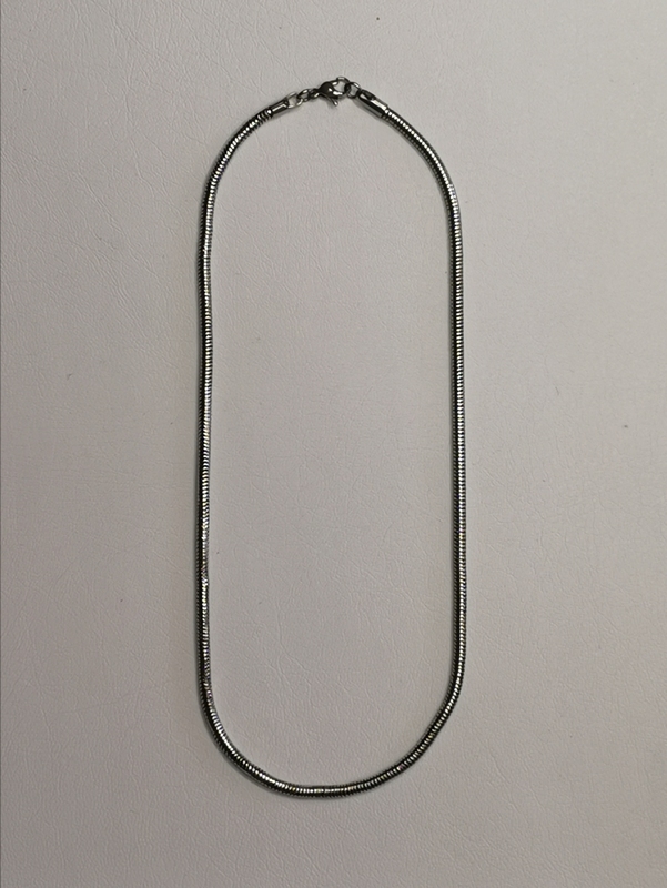 Řetízek z chirurgické oceli, kulatý hádek široký, ohebný. Řetízek je 45 cm dlouhý, to znamená, že dámě běžné postavy sahá cca 2 cm pod kliční kost. Protože hádek je poměrně silný, může se nosit bez přívěsku jako náhrdelník. Pokud by měl sloužit k přívěsu, ten může být poměrně velký. Na krku vypadá skvěle.