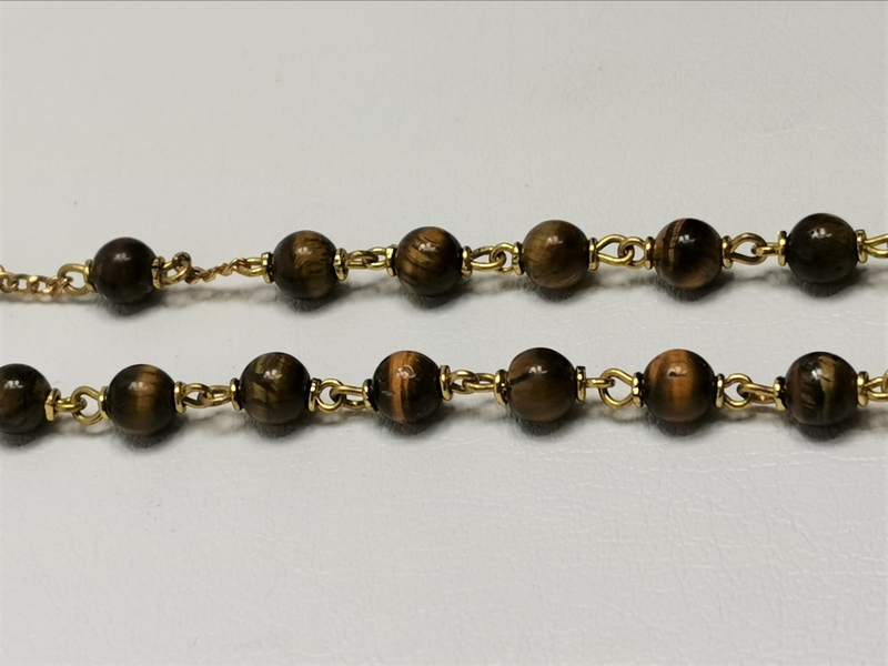 Elegantní a originální růženec vyrobený z polodrahokamu tygřího oka, jednotlivé kuličky mají průměr 6 mm a jsou umístěny na pevném stříbrném bižuterním řetízku. Vyrobeno ručně v České republice.