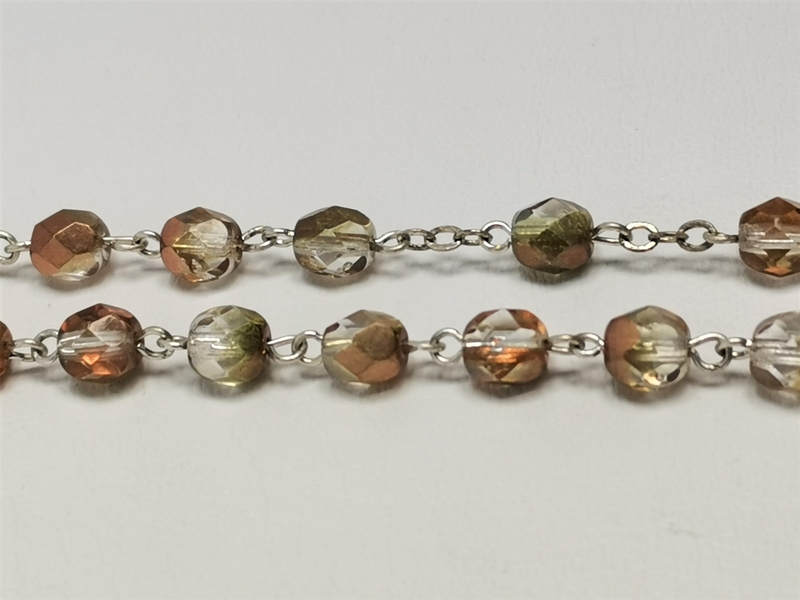 Krásný růženec vyrobený z broušených skleněných kuliček, jednotlivé kuličky mají průměr 6 mm a jsou umístěny na pevném stříbrném bižuterním řetízku. Vyrobeno ručně v České republice.