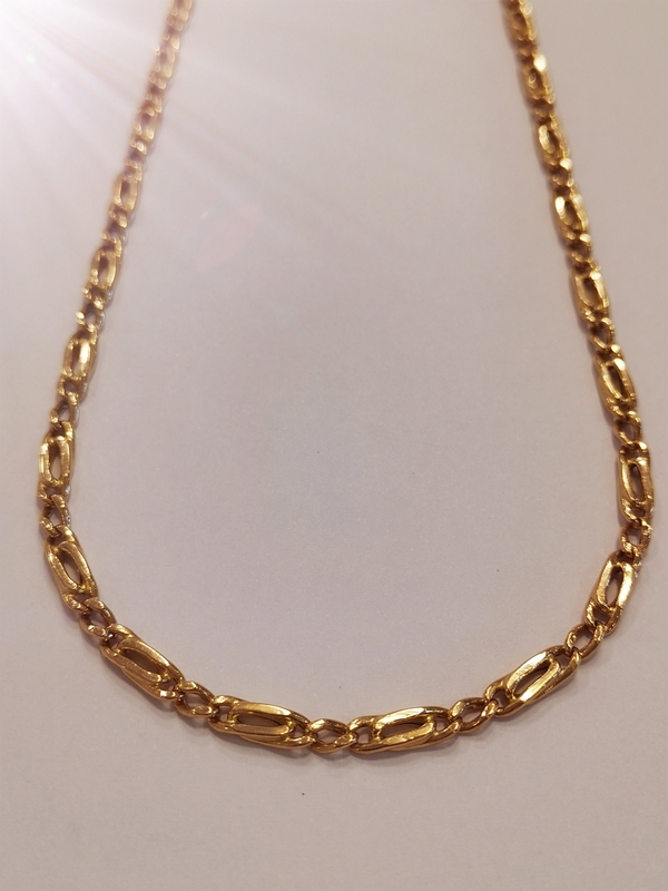 Stylový zlatý řetízek, neokoukaného vzoru, s kvalitním zapínáním na karabinu. Délka 61 cm je dostatečná jak na dámský krk, tak na pánský. Řetízek je vylehčený.