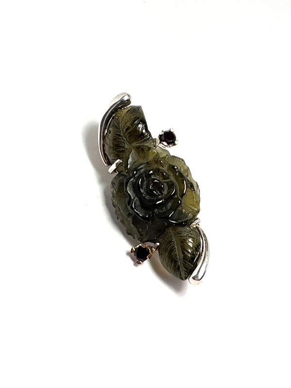 Stříbrná brož s vltavínem vybroušeným do tvaru růže