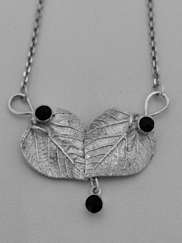 Stříbrný dámský náhrdelník, který je tvořený ze dvou lipových listů zdobených českými granáty a jedním granátkem visícím. Je to originální, ručně dělaný, autorský šperk Jiřího Moravce.