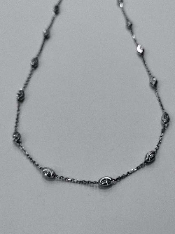 Krásný, jemný dámský náhrdelník ze stříbra 925/1000. Oválky jsou pravidelně rozmístěny po celé délce řetízku. Na krku vyniká svou nevšedností.
