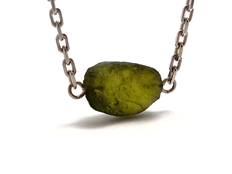 Stříbrný náhrdelník s přírodním vltavínem. Délka 43,5 cm cca 1cm pod klíční na běžném dámském krku. Stříbrný řetízek anker je dostatečně silný, ukončený karabinou.