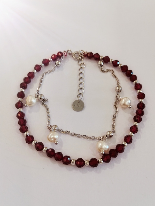 Náramek je dvojitý. První náramek tvoří korálky z granátu a stříbrné korálky. Druhý náramek tvoří stříbrný řetízek se stříbrnými kuličkami a bílé zavěšené perličky. Kameny jsou přírodní.
