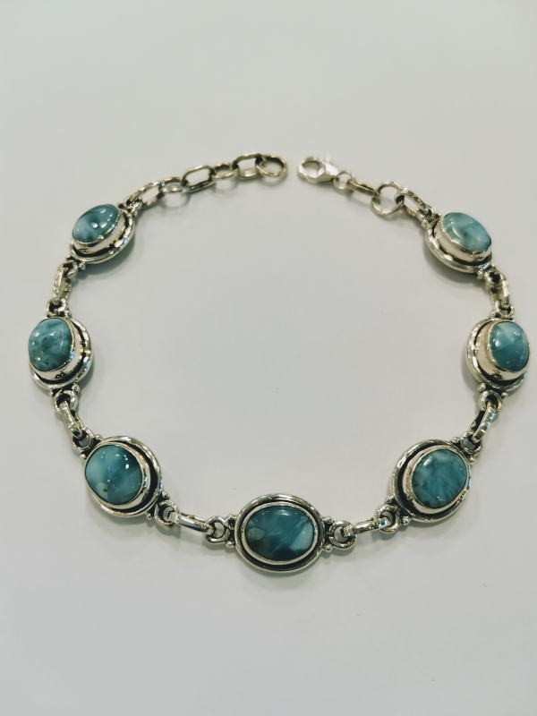 Stříbrný náramek je vyroben ze stříbra ryzosti 925/1000, jehož povrch byl ošetřen rhodiem. Rhodium šperk ochrání proti zčernání, zežloutnutí i poškrábání. Náramek je složen z několika stříbrných oválků, do kterých je larimar vsazen. Jelikož náramek neobsahuje přídavek niklu, mohou jej bez obav z alergické reakce nosit i alergici.
