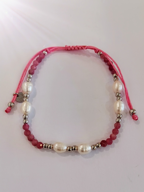 Náramek tvoří bílé perličky, růžové korálky z turmalínu a stříbrné korálky. Kameny jsou přírodní.