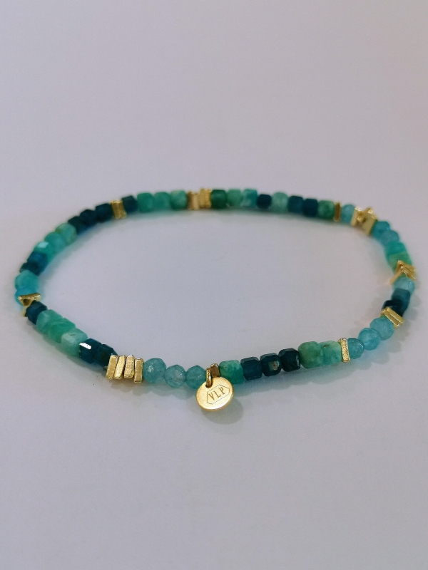 Náramek tvoří bílé barevné korálky z jadeitu, amazonitu a stříbrné, zlacené korálky. Kameny jsou přírodní.