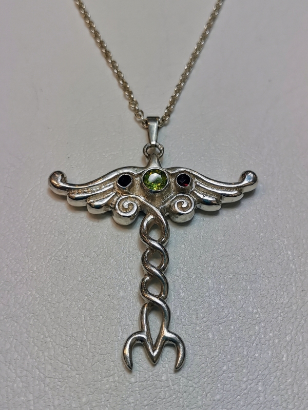 Stříbrný přívěs "drak" je dozdoben centrálním olivínem a dvěma českými granáty . Je to originální, ručně dělaný, autorský šperk Jiřího Moravce.