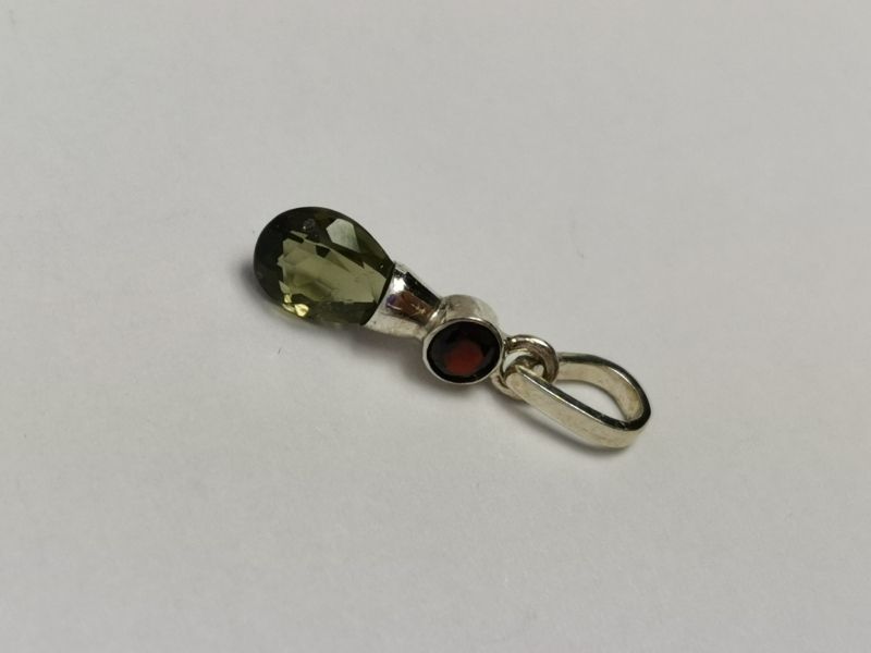 Originální stříbrný přívěs s vltavínovou krásně vybroušenou kapkou. Je dozdobený almandinem. Přívěs je velmi jemný a elegantní.