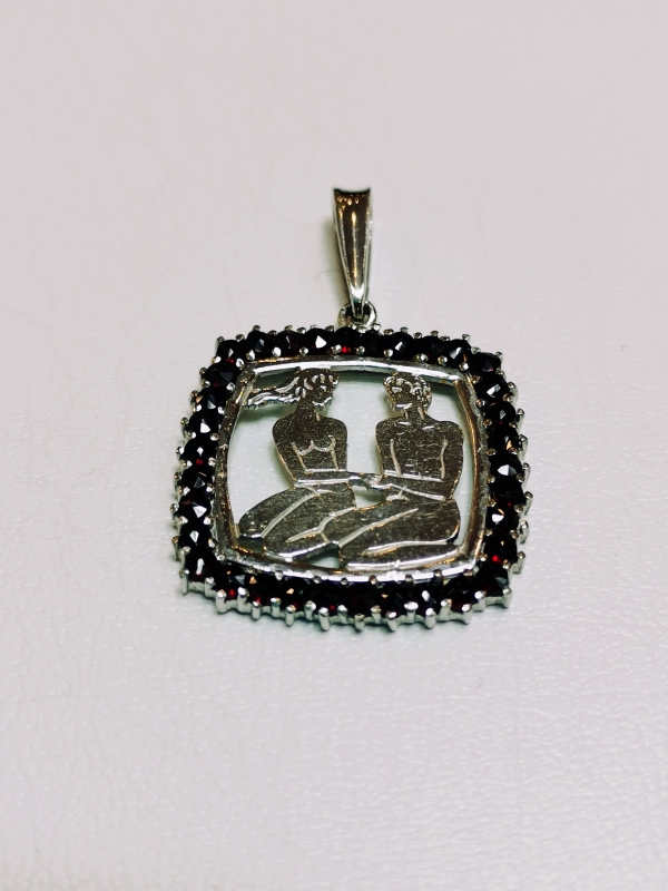 Stříbrný přívěsek - blíženci s českými granáty. Přívěs je rhodiovaný, proto odpadá starost s čištěním šperku. Vhodný dárek pro toho, kdo má rád českou tradici, záruku kvality.