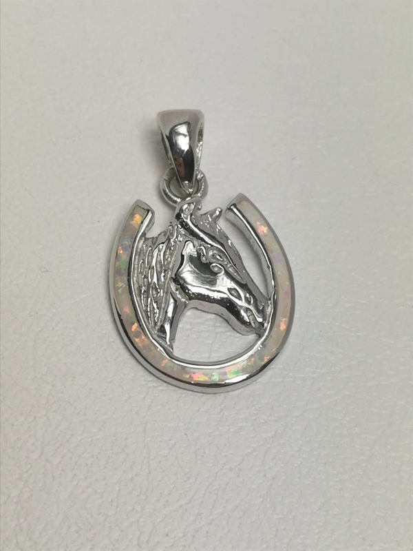 - Stříbrný přívěsek kůň v podkově s opálem, rhodiovaný