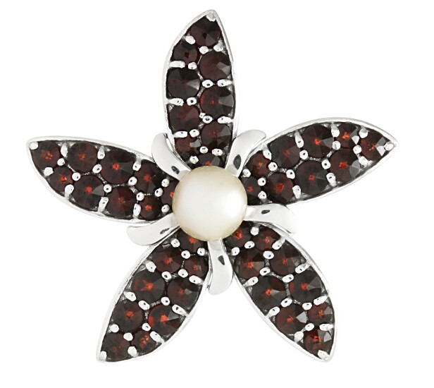 Stříbrný přívěsek s českými granáty a perličkou, rhodiovaný. Přívěsek je moderního designu ve tvaru květiny.