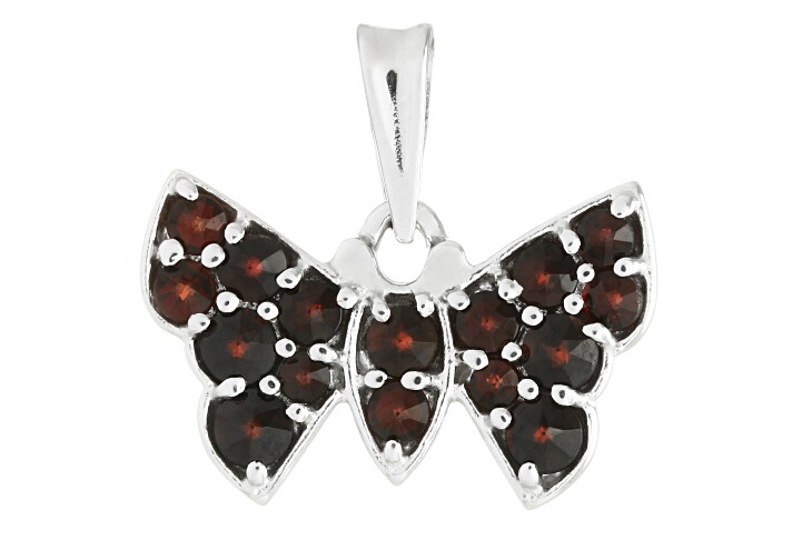 Stříbrný přívěsek s českými granáty, rhodiovaný. Přívěsek je moderního designu ve tvaru motýla.