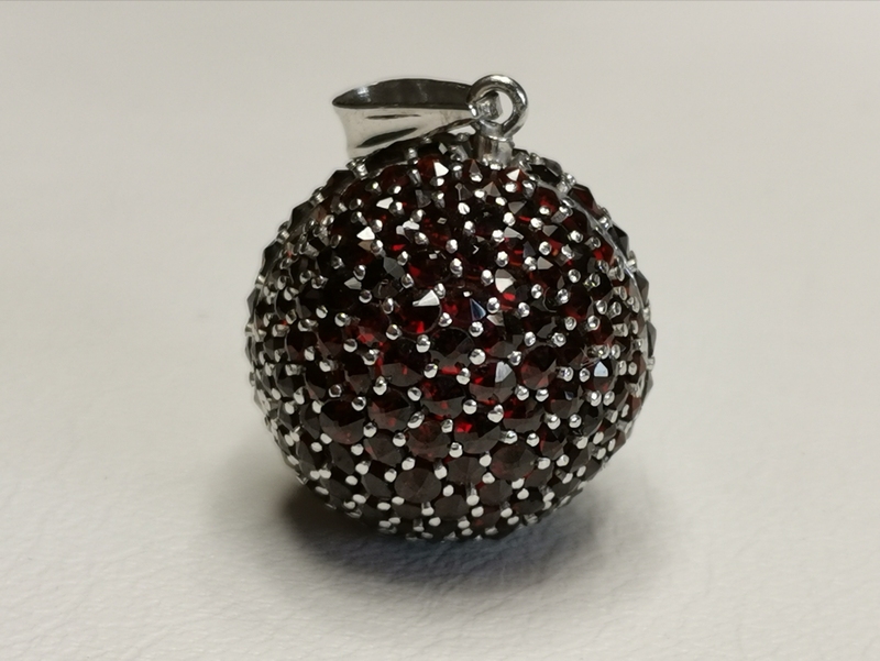 Stříbrný přívěsek s českými granáty, rhodiovaný. Přívěsek je klasického designu ve tvaru koule. Vypadá velmi luxusně a krásně.