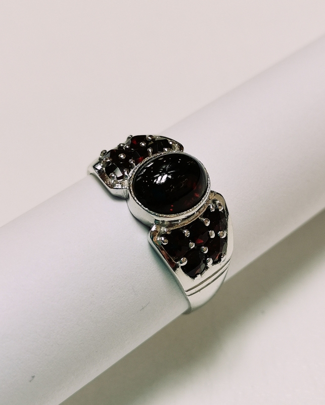 - Stříbrný prsten s českými granáty, rhodiovaný