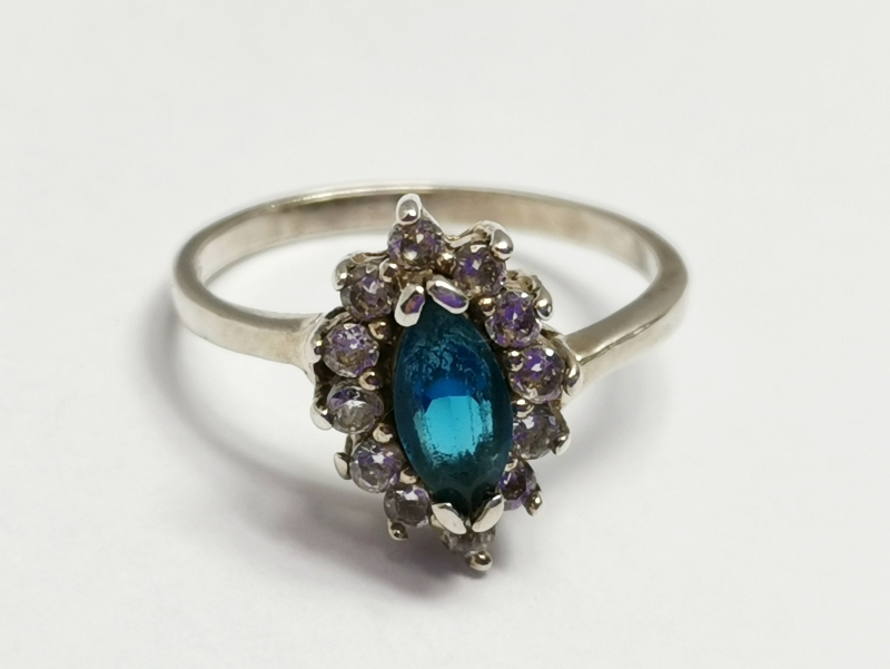 - Stříbrný prsten s modrým kamenem a se zirkony