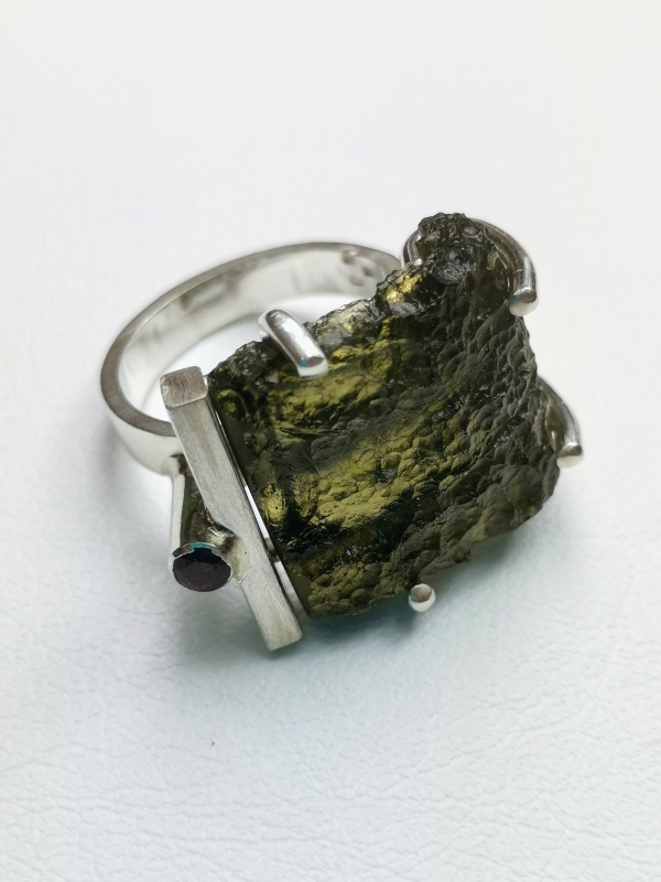 - Stříbrný prsten s vltavínem a českým granátem - autorský šperk Jiřího Moravce