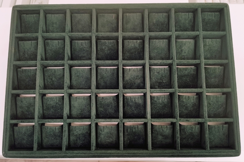 Tmavě zelené předkládací plato na přívěsky ze sametu. Rozměr plata 350x240x40 mm, na 40 ks přívěsků, párů naušnic.