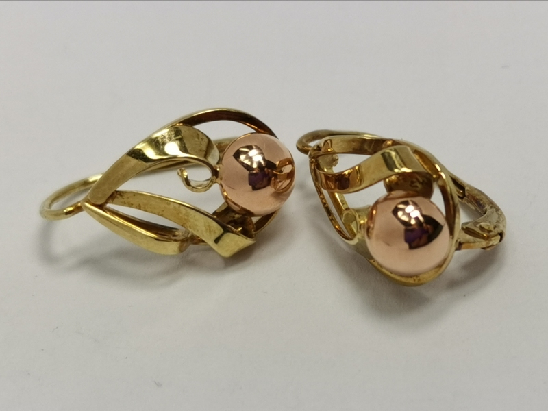 Krásné, bohaté zlaté naušnice ze žlutého zlata, zdobené kuličkou ze zlata červeného. Zapínání na klapku. Na uších vypadají velice elegantně.