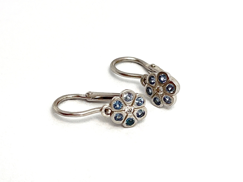 Krásné, klasické dětské zlaté naušnice pomněnky z bílého zlata se světle modrými kamínky. Zapínají se dopředu.