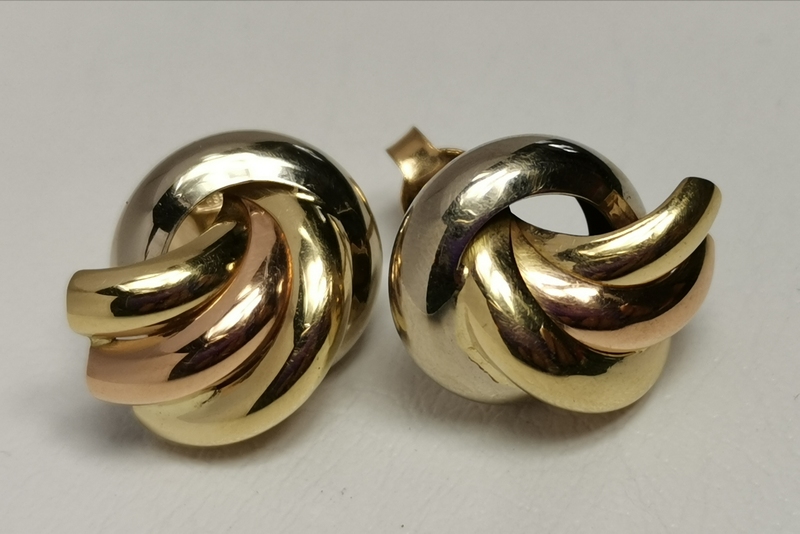 Zlaté naušnice kruhy ze tří druhů zlata se zapínáním na puzetu. Vnější kruh je ze zlata bílého, vnitřní jsou dva krajní ze žlutého, prostřední z červeného. Puzeta je velmi pevná. Na uších vypadají naušnice velmi elegantně, originálně.