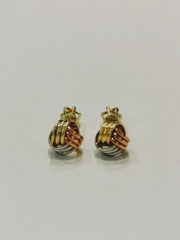 Krásné zlaté naušnice ze žlutého, červeného a bílého zlata ve tvaru uzlu. Zapínání na šroubek. Na uších vypadají velice elegantně.