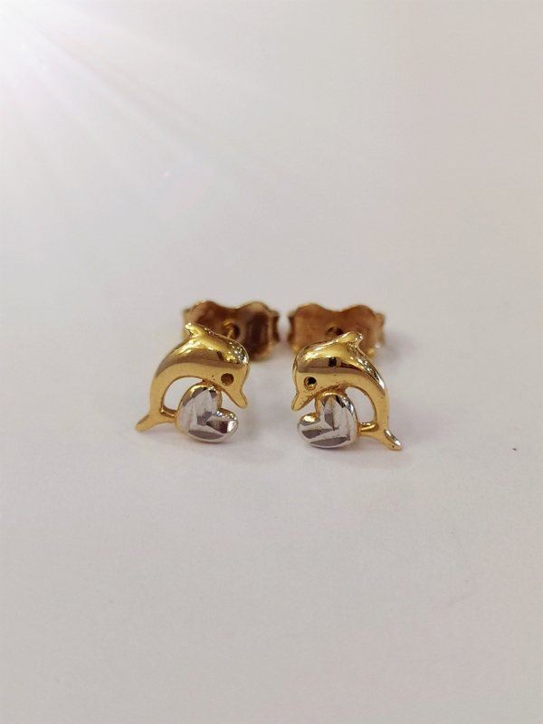 Zlaté pecky, delfíni, ze žlutého zlata na puzetu, srdíčko je ze zlata bílého.