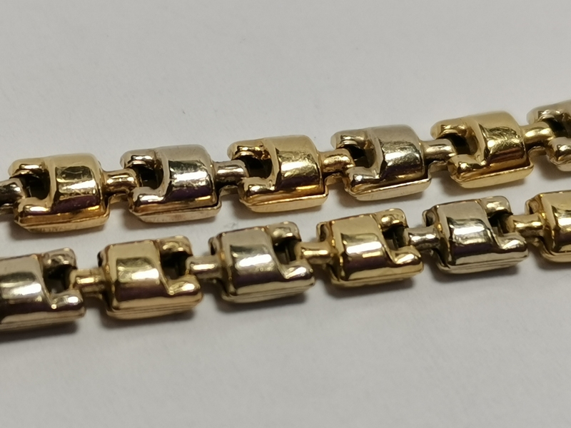 Exkluzívní zlatý dámský náramek ozdobný je vyroben ze žlutého a bílého zlata. Je složený z článků a střídá se článek žlutý s článkem bílým. Náramek je krásného, neobyčejného vzoru. Délka 17,5cm cm odpovídá normálnímu zápěstí.