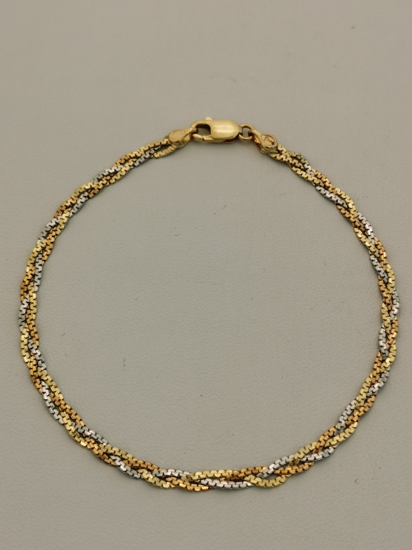 Elegantní zlatý dámský náramek, který je spletený z pramenů žlutého, růžového a bílého zlata. Délka 19 cm odpovídá silnějšímu zápěstí.