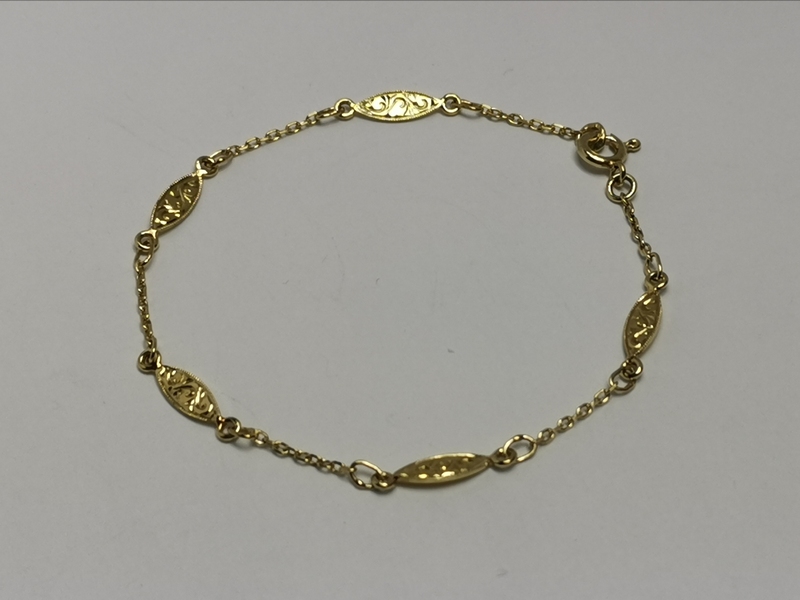 Exkluzívní zlatý dámský náramek, který je tvořen z oválků žlutého zlata, které jsou spojeny řetízkem. Oválky jsou ručně ryté. Náramek je krásný, velmi elegantní. Délka 16,5 cm odpovídá slabšímu zápěstí.