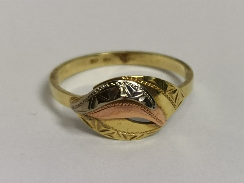 Krásný zlatý prsten, bohatě zdobený ručně rytými lístky ze žlutého, červeného a bílého zlata. Je klasického designu. Velikost 56 patří mezi velikosti dámského středního prstu.